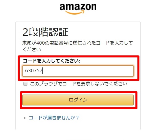 二段階認証を求められた場合、Amazonに登録している電話番号にセキュリティコードが届きます。