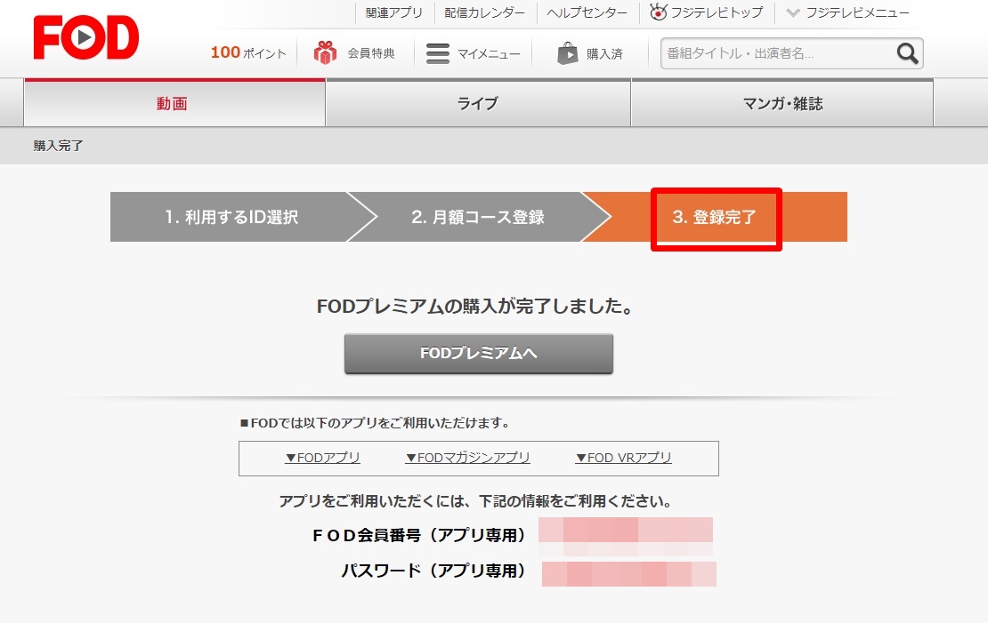 『登録完了』の画面とともに、「FOD会員番号」「パスワード」が表示されたらFODプレミアムの登録は完了です。